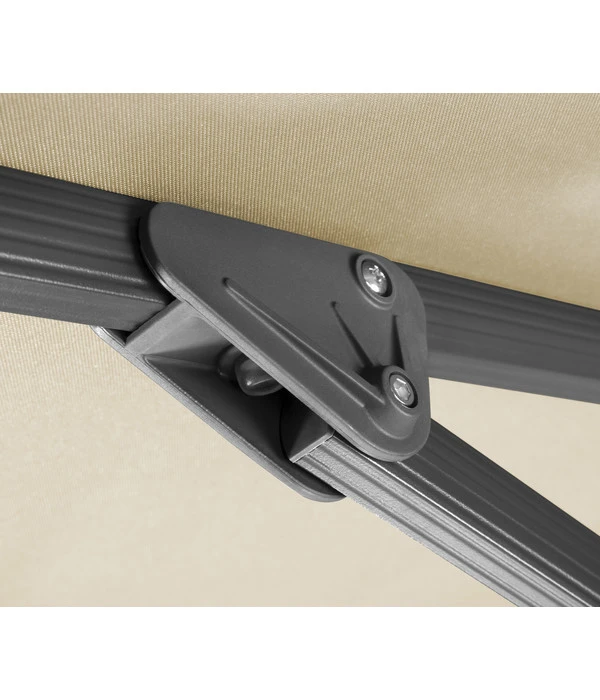 Die Schirmbespannung besteht aus 100 % Polyester mit einer guten Stärke von 200g/m², die sehr widerstandsfähig und verrottungsfrei ist. Außerdem wurde die Bespannung wasserabstoßend imprägniert, weshalb Sie auch bei einem leichten Schauer nicht nass werden unter dem Schneider Ampelschirm Rhodos Smart. Und die Air-Vent-Ausstattung sorgt dafür, dass es auch an heißen Sonnentagen nie stickig unter dem Schirm wird. Außerdem ist im Lieferumfang eine Schutzhülle mit Reißverschluss enthalten.